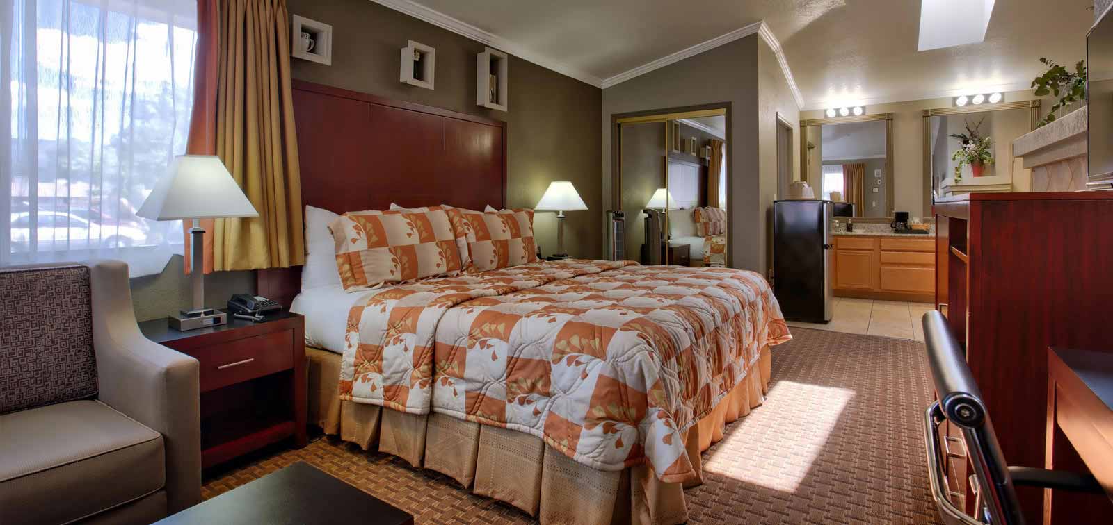 Our Single King Bed with Spa Jet and a panoramic view of Red Rocks is another type of room you can choose. It provides you with a romantic getaway experience. The luxurious king-size bed is complemented with natural light coming room the ceiling to offer you sufficient light. An electric fireplace will spruce up your body by warming you up during those cold days or nights. A Spa Jet bathtub is another feature you find in the Single King Size bed with Spa Jet. For guests seeking a great experience in one of the budget hotels and motels in Sedona Arizona, Views Inn Sedona offers you a comfortable environment and great amenities to ensure you have a stylish, comfortable, and relaxing experience when you stay in our hotel.